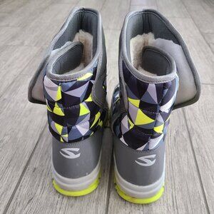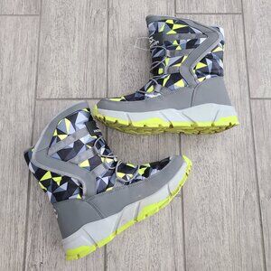Bold and functional Hobibear winter snow boots featuring a geometric pattern in shades of grey, navy, white, and neon yellow. These insulated boots are lined with plush faux fur for warmth and comfort, with a durable waterproof design and traction soles for stability in snowy or wet conditions.
