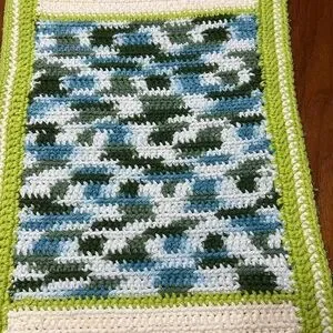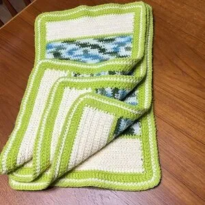 The beige/cream, blue and various greens blend together beautifully, and the crochet detailing adds an extra layer of texture and elegance.