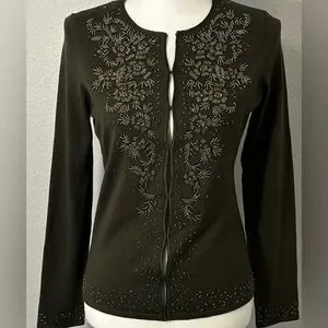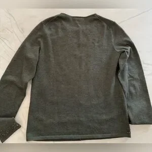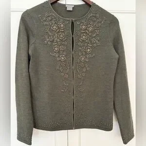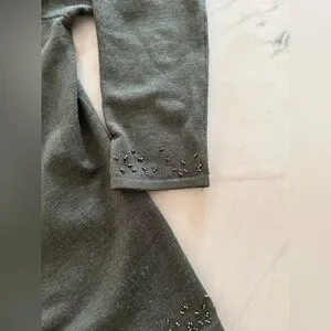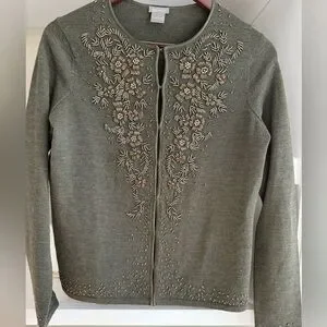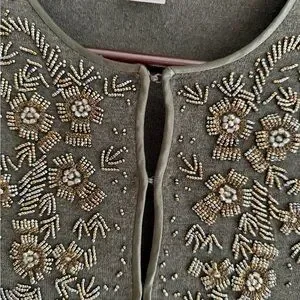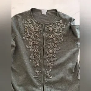 Beautiful detailed with beads ultra fine merino wool that is soft …with beads thru out front and sleeves and hem line .