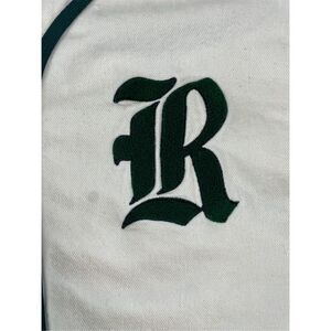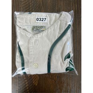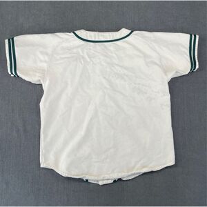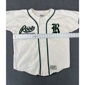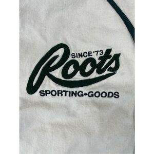 Vintage Roots Sporting Goods baseball jersey in a white cream color with green trim and lettering. Features a button front and soft 100 percent cotton terry cloth interior. Tagged size S M and fits a sporty aesthetic. Some discoloration on the back as shown, consistent with age and wear. Great for fans of retro athletic style or casual throwback looks. Please see photos for measurements and close ups of flaws.