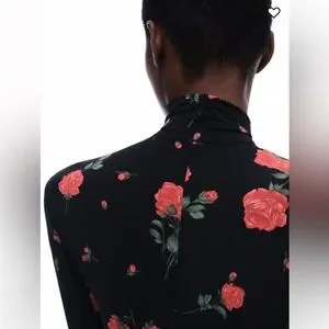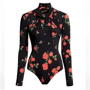 MAGDA BUTRYM H&M. Bodysuit in lightweight stretch jersey with an all over print design. Features additional, wrap panels at the top of the front with an appliqué at the junction. Both the print and appliqué feature the designer’s signature rose design. The appliqué is double layered and reinforced with wire to ensure it maintains its structure and volume. Double layered high neck, long sleeves and a concealed hook and eye fastener and zip with a rose shaped zip pull at the back. Concealed silicone tape around the leg openings and press studs at the crotch.