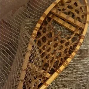 Classic wooden snowshoes with intricate weaving. Perfect for winter adventures.