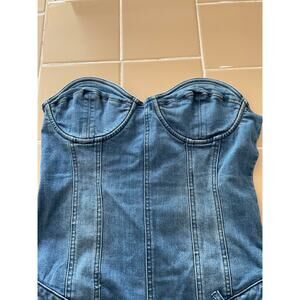 Akira Strapless Denim Top Size Medium Wire Cups Back Zip Seam Detailing, Stretch, corset style without boning, Elastic back top seam, Thick denim, Cotton/Modal/Polyester/Spandex. Excellent condition.