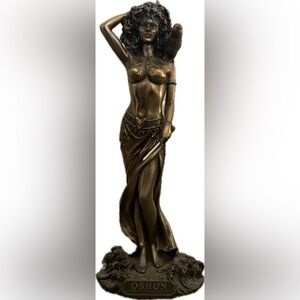 Oshun is an Orisha who reigns over love, intimacy, beauty, wealth and diplomacy. She is beneficent, generous, very kind, but has a horrific temper. When she loses her temper, it causes untold destruction. This statue depicts Oshun holding a mirror with a pretty green parrot on her shoulder. Made of cold cast resin, it measures 9 1/2 inches tall, 4 inches wide, 3 inches deep, and the base is lined with felt to prevent it from scratching delicate surfaces. The beautiful bronzed finish is highlighted by hand painted accents that emphasize the detail in this piece, from the feather in Oshun's hair to her golden hoop earrings.