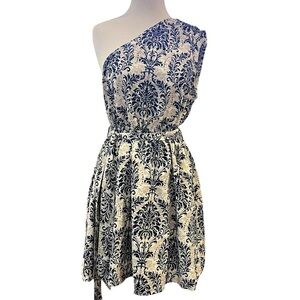 Cupshe Asymmetrical One Shoulder Pleated Blue Damask and Cream Mini Dress Large