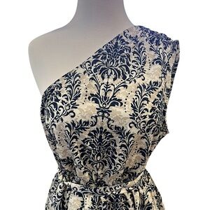 One-Shoulder Damask Mini Dress. This mini dress combines a one-shoulder design with a chic damask pattern, pleated skirt, and tie belt. Unlined, lightweight and perfect for warm weather.