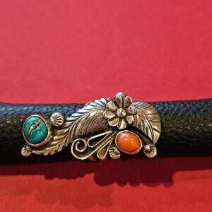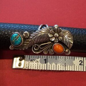 Vintage Native American Sterling, Coral and Turquoise Ring, size 5.5. Signed WMD. It's in a traditionally styled flower and feather design, about 1.5" long so it's very eye-catching. Acid tested as sterling silver. The turquoise stone is either cracked or has a natural fissure but it doesn't take away from the beautiful silver work.