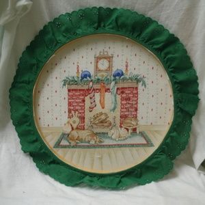 Vintage Christmas Decoration handmade with cotton cloth and an embroidery hoop. Picture printed on cloth is a fireplace with cat and dog. Green ruffle around the outside. Made with a 10 inch embroidery hoop. Total diameter is about 13 inches. Good condition, no tears or stains. Great with any holiday decor.