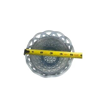 This vintage Imperial Glass dish is a stunning addition to any collection. The lacy edge and blue opalescent trim make it a beautiful display piece, while the single compartment and glossy finish make it perfect for serving guests. Crafted in the United States in the 1930s, this original piece is a must-have for any lover of mid-century modern design. The dish is in excellent shape and ready to be enjoyed for years to come.