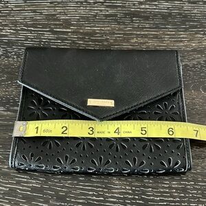 This black leather clutch has a floral cut out pattern, a snap front closure, is fully tan polka dot lined with I.D. Slots on one side. It can also be used as a crossbody if you add a strap to it(not included). In excellent condition!!