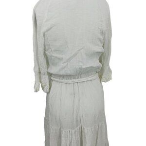 Design: Beautiful boho dress with lace trimmed colora and cuffs, tiered peasant ruffle skirt and elastic and tie waist. This would be perfect for a summer festival or a beach wedding.