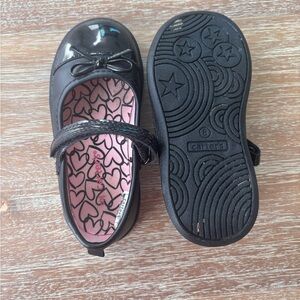Chic black Mary Jane shoes with a glossy finish. Adorned with a cute bow. Pink heart-patterned interior adds fun.