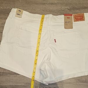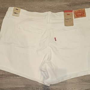 These Levi's white jean shorts feature a crisp, clean look with a slightly distressed hem for a trendy touch. Crafted from durable denim, they offer a comfortable fit perfect for casual outings. The mid-length cut provides a versatile style that pairs well with any top.