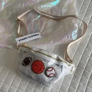NEW with tags! Custom Stoney Clover Lane sports belt / bum bag. Perfect for the sports mama. Clear belt bag with sports patches. Features a gold zipper and tan strap.