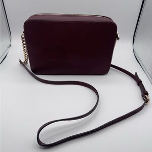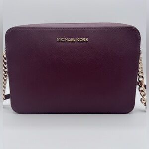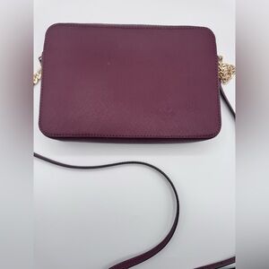 Chic Michael Kors crossbody in dark purple. Features gold chain strap. Perfect for any outing.