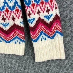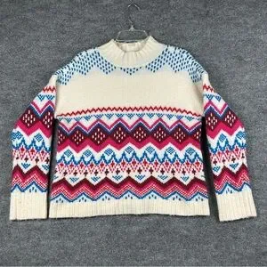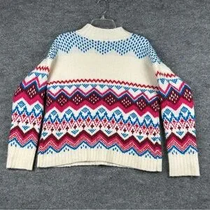 LOFT Fair Isle Mock Neck Sweater - Size Medium A cozy and vibrant essential for the winter season! This thick, soft knit sweater features a gorgeous Fair Isle / Nordic Geometric Pattern in bright Fuchsia Pink, Royal Blue, Red, and Burgundy on a cream base. The wool blend fabric is warm and soft