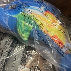 Vibrant tie-dye plush toy with a mix of blue, green, and yellow colors. Perfect for playtime.