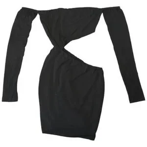 Turn heads in this sleek and sultry black off-the-shoulder cutout mini dress. The flattering bodycon fit hugs your curves in all the right places, white the front waist cutout adds a bold, modern edge. With long sleeves and a smooth, stretch fabric, this dress is equal parts sexy and sophisticated. Perfect for your next night out, party or special occasion. Pair with strappy heels and a clutch for a stunning night out look. Excellent pre-owned condition.