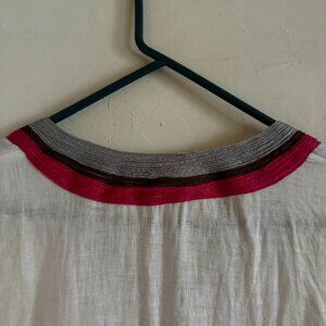 Calypso knows tunics. Here is a versatile, fresh, white linen version with intricate fuchsia and grey embroidery, perfect over your bathing suit or for lunch.