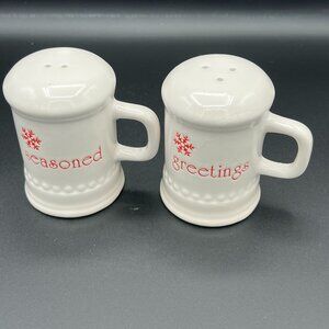 This is a pair of white ceramic salt and pepper shakers, each designed in the shape of a small mug with a handle. They feature festive red decorations, with one shaker reading "seasoned" and the other "greetings," along with snowflake motifs. The bottoms of the shakers have rubber stoppers and are marked "FOODSAFE Microwave & Dishwasher Safe," indicating their modern production.