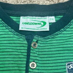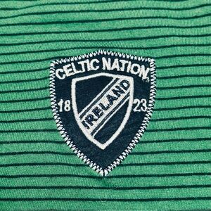 Authentic Lansdowne Collection boys’ long-sleeve shirt featuring “Celtic Nations Ireland Rugby” embroidery and a classic green-and-navy stripe pattern. Lightweight cotton material with a 3-button Henley neckline — perfect for everyday wear or showing Irish pride!