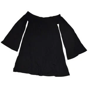 Effortlessly chic and endlessly versatile, this black off-the-shoulder mini dress is a must have for your wardrobe. Featuring bell sleeves, a flattering neckline, and a sleek silhouette, it's perfect for everything from a night out to a dinner date or special event. The soft stretch fabric offers a comfortable fit while keeping a polished, on-trend look. Add ankle boots and a leather jacket for an edgier fall outfit. Style with knee-high boots and a wide brim hat for a trendy, boho vibe. Excellent pre-owned condition.
