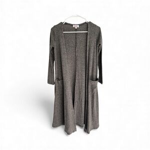 LuLaRoe Sarah long duster cardigan in a gray ribbed knit fabric.