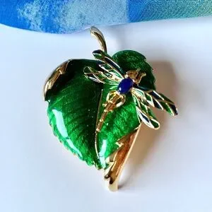 Vibrant green enamel leaf brooch features a blue and green dragonfly with blue bead. Gold tone metal back.
