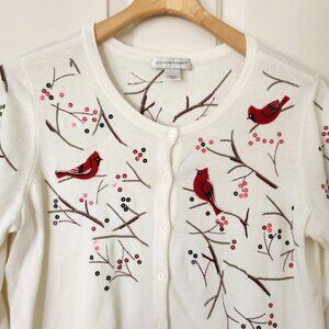 Embroidered Cardinal Sequins Cardigan Sweater Cream Red Grandma Winter Holiday