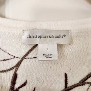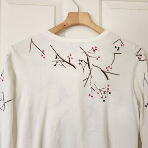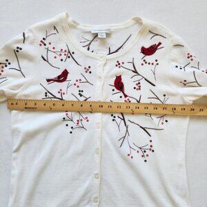 Cute cardigan sweater with fuzzy embroidered cardinals on the front, as well as winter tree branches and berries made of shiny red and silver sequins on the front, back and on each sleeve. Size Large.