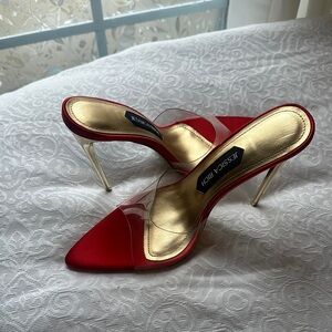 These elegant high-heeled shoes feature a vibrant red satin-like pointed toe and a luxurious gold inner sole. The sleek stiletto heel adds sophistication, making them perfect for formal occasions.