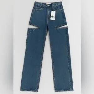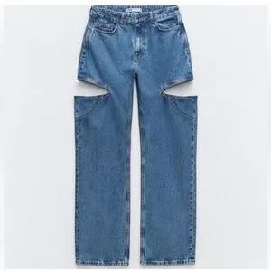 Stylish straight leg jeans from Zara. Mid blue hue. Perfect for versatile wear.