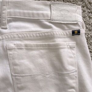 Love it that low rise skinny jeans are back in style!! These skinny jeans are the perfect addition to any wardrobe. Beautiful white denim with spandex for stretch, molds and moves with your body. 5 pocket. Zipper and button fly. Note pink cotton & brass zipper with signature clover leaf stamped zipper pull (see pic 8). Signature button at fly (see pic 9). Pink overstitching on interior waistband. Rivets at front pockets. White ‘Lucky’ patch at rear waistband and lucky emblem on right rear yolk (see pic 7).