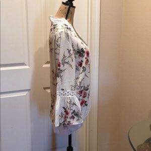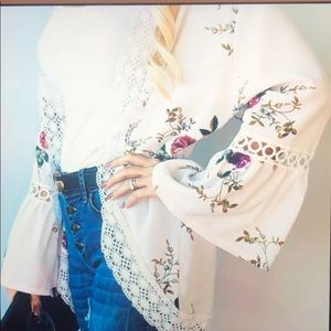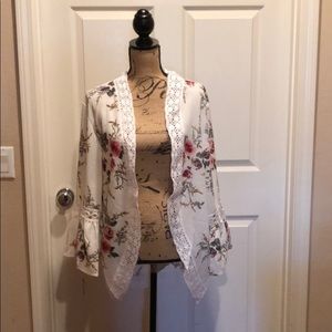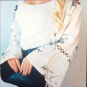 Off white floral print short kimono, bell sleeves and lace inlet. Bust-24.5, length high to low 21”-28.5” 95% polyester, 5% spandex,