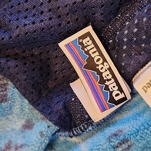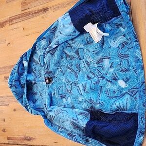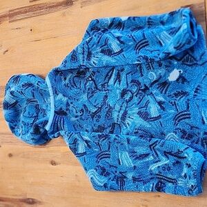Soft fleece hoodie with a vibrant blue pattern. Ideal for keeping warm outdoors. Some pilling and wear on cuffs. Good condition. Pet friendly home.