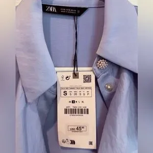 Chic Zara blouse with elegant ruffles. Soft blue hue. Ideal for versatile styling.