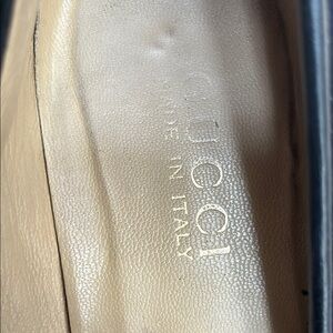 Gucci Women’s Black Suede Loafers with Gold Detail.