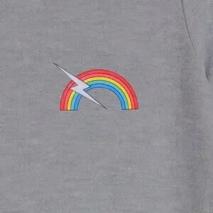 Color: Heather gray with stripes and rainbow and lightning bolt graphic design