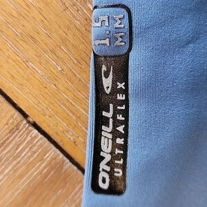 Light blue wetsuit top with black accents. O'Neill logo on chest and sleeve. 1.5mm. White spot on the front. Pet friendly home.