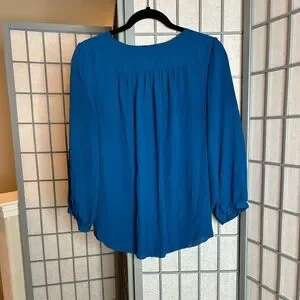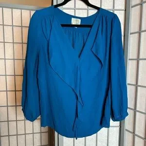 Chic Anthropologie Maeve teal blouse with ruffle detail. Three-quarter sleeves. Ideal for versatile styling.