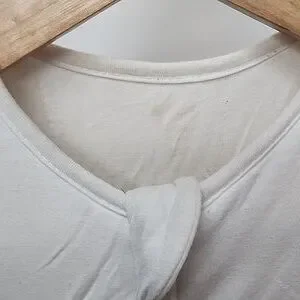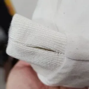 Well loved. Yellowing around neck, arms, cuffs. Some pilling and inside stitching coming unraveled. One cuff has tear that could easily be sewn. Pet friendly home.