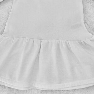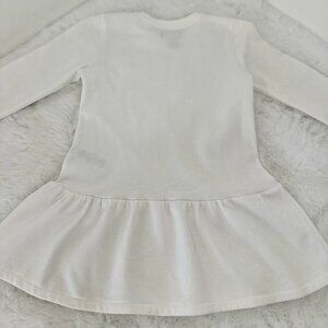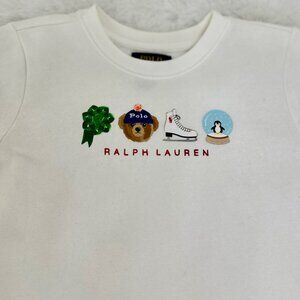 This adorable Polo Ralph Lauren dress combines sporty comfort with signature designer style. Crafted from soft cotton-blend fleece, it features a crew neckline, long sleeves, and a playful drop-waist ruffle hem for a cute, casual silhouette. The front showcases a fun Polo graphic design — including the iconic bear, sneaker, and logo — adding a touch of charm and character.