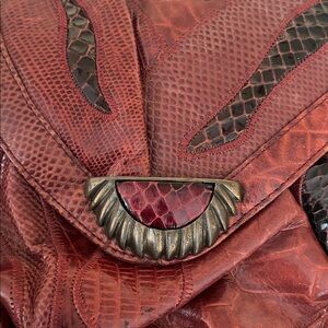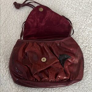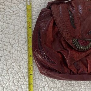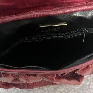 Elegant burgundy shoulder bag with black textured accents. Distinctive design for a fashionable look. Measurements in pictures.