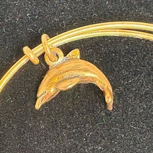Elegant gold tone bangle bracelet featuring a charming dolphin and energy charms. Perfect for adding a touch of the beach to any outfit. Good preowned condition.