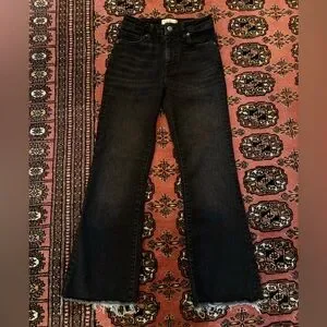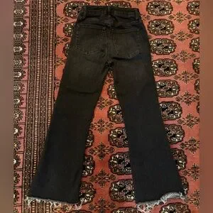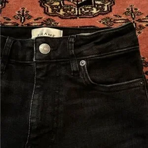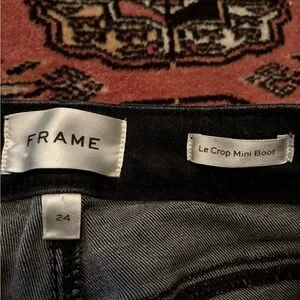 Black Frame Jean size 24 fits true to size just lots of stretch in the Jean. And more of a cropped fit so good for a petite girl. No damages or imperfections.