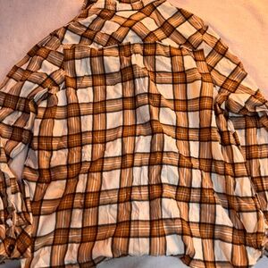 Stylish plaid button-up shirt with a classic design. Features a mix of brown and cream colors. Plaid Button-Up Shirt super cute long sleeve