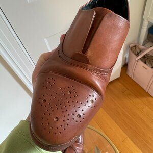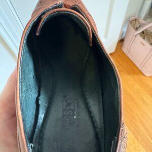 From the luxurious Spanish brand PIKOLINOS, these slip on oxfords in a smooth rich brown leather feature a wingtip design on the almond toe, non-marking soles, and full leather insoles throughout. The split vamp with tongue hides an elastic gore on instep for ease of putting on and flexible comfort. With the classic wingtip design, sturdy but non-marking sole and 3/4" stacked heel, they're both distinguished and made to last! This pair has some wear, as shown, mostly on the soles and the insoles' markings are faded, but the stitching, padding, and construction are in really good condition and ready for you to slip on and step out in style. Recently cleaned, conditioned, and polished. Ships from smoke-free home.