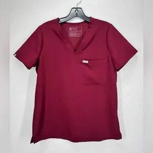 Elegant maroon scrub top by Figs. V-neck design with a convenient chest pocket.