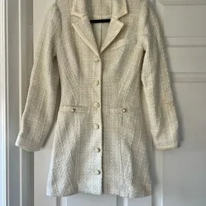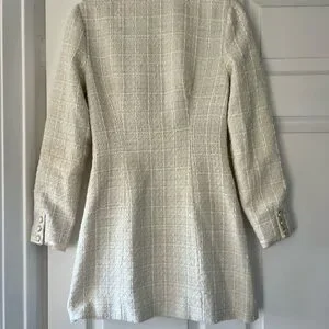 Elegant ivory blazer with a textured finish. Features button front and tailored silhouette. Ideal for sophisticated looks. The Reformation Jolie Dress is a mini dress featuring long sleeves, a collared v neckline, and a button front. The dress is made of a textured fabric and has a classic silhouette. It is perfect for a variety of occasions, from cocktail parties to holiday events.
