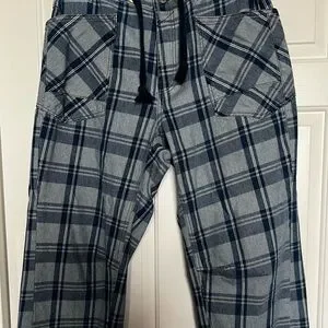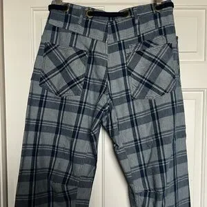 Stylish plaid jeans. Relaxed fit. Perfect for casual wear. Adjustable tie waist straight barrel ankle/cropped design.